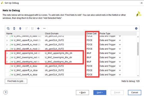 注意:這里最好將需要測(cè)試的端口信號(hào)打一拍再進(jìn)行測(cè)試,因?yàn)檩斎胼敵龆丝诘尿?qū)動(dòng)單元類型往往是不一樣的,比如兩個(gè)紅框之間的rgmii_txd信號(hào)它的驅(qū)動(dòng)單元類型就是ODDR,這將影響布線到此處的邏輯分析儀ila的探針的連接,具體的我也不清楚應(yīng)該是驅(qū)動(dòng)能力不匹配之類的,反正最好實(shí)現(xiàn)的時(shí)候會(huì)報(bào)錯(cuò)。如果不打拍則在后續(xù)設(shè)置setup debug的時(shí)候就要注意去除不符合驅(qū)動(dòng)類型的信號(hào)。