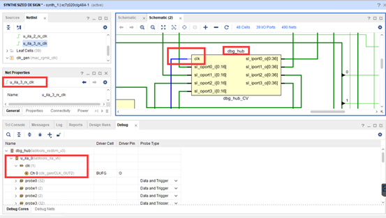這是兩張?jiān)韴D,后者的紅框框部分是添加的4個(gè)ila模塊,中間藍(lán)色圓框部分是debug hub,即連接FPGA和jtag的部分。