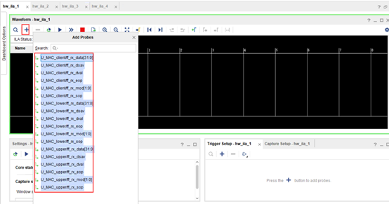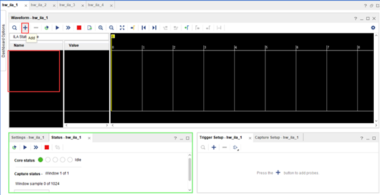 下載完成后會(huì)彈出4個(gè)dashboard對(duì)應(yīng)著4個(gè)不同時(shí)鐘域的ila模塊,可是沒有信號(hào),這時(shí)可以點(diǎn)擊+號(hào)進(jìn)行添加。
