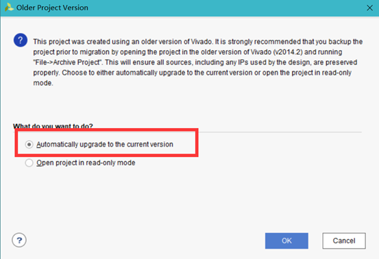 1、直接用新版本vivado打開原有工程文件,進(jìn)行IP核更新;2、拷貝原有工程設(shè)計(jì)文件、約束文件、IP核文件夾至新建新版本vivado空白工程文件下,進(jìn)行更新。1、在舊版本vivado基礎(chǔ)上直接升級(jí)