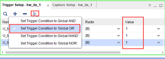 添加完信號(hào)后注意右下角的觸發(fā)條件設(shè)置,同樣點(diǎn)擊+號(hào)設(shè)置需要添加的信號(hào),這里選則的是幀起始標(biāo)志sop,并且選擇觸發(fā)條件的關(guān)系為或,同時(shí)觸發(fā)值設(shè)置為1’b1,之后再點(diǎn)擊三角型的 run trigger符號(hào)即可。