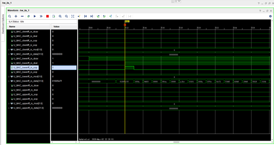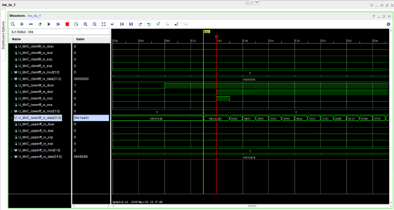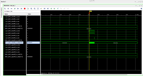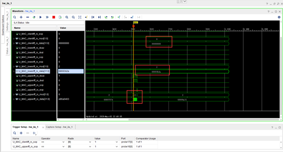 這邊按照同樣的步驟,添加觀察信號(hào)、添加設(shè)置觸發(fā)條件、點(diǎn)擊run trigger,就能看到波形了,注意放大后的紅框部分,有了前導(dǎo)碼,按單字節(jié)應(yīng)該是 55 55 55 d5的順序而這里由于是rgmii只是半字節(jié),所以是 5 5 5 5 5 5 5 d。