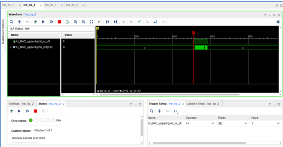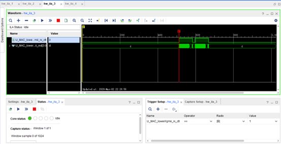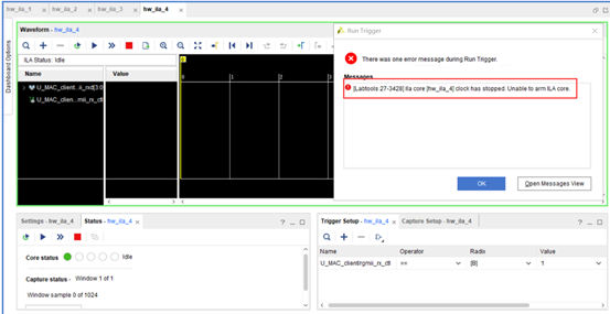 對(duì)ila3按同樣的步驟操作當(dāng)我們點(diǎn)擊run trigger的時(shí)候會(huì)發(fā)現(xiàn)出現(xiàn)unable to arm ila core的錯(cuò)誤,這就是時(shí)鐘域的問題,由于我們選擇的是rgmii_rx_clk這是由phy提供的,但是ila3即例化時(shí)的client對(duì)應(yīng)的phy沒有插網(wǎng)線,所以也沒有時(shí)鐘,自然無法arm ila core。