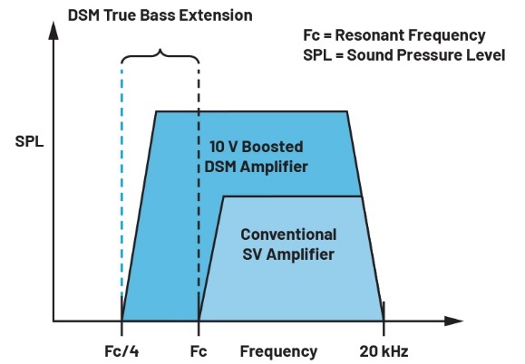 根據(jù)應(yīng)用,MAX98390可將低頻下潛深度增加多達兩個八度,并實現(xiàn)2.5倍響度(圖4)。此外,這款放大器具有出色的功耗表現(xiàn)4,滿足升壓型D/G類放大器的要求。而且,它具有感知功率降低(PPR)特性,可在不影響音頻保真度的情況下,將效率進一步提高25%。MAX98390為系統(tǒng)設(shè)計提供了靈活性,配備帶有包絡(luò)跟蹤功能的可編程升壓轉(zhuǎn)換器,以達到理想效率。