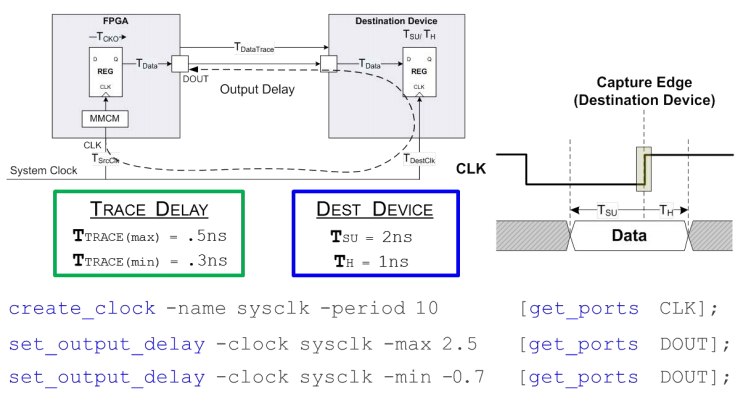 上圖是一個 SDR 上升沿采樣系統(tǒng)同步接口的 Output 約束示例。其 中,-max 后的數(shù)值是板級延時的最大值與下游器件的 Tsu 相加而得出, -min 后的數(shù)值則是板級延時的最小值減去下游器件的 Th 而來。