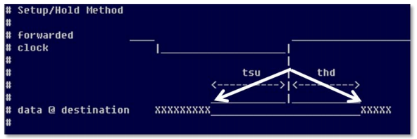 方法一我們稱作 Setup/Hold Based Method,與上述系統(tǒng)同步接口的設置思路基本一致,僅需要了解下游 器件用來鎖存數(shù)據(jù)的觸發(fā)器的 Tsu 與 Th 值與系統(tǒng)板級的延時便可以設置。