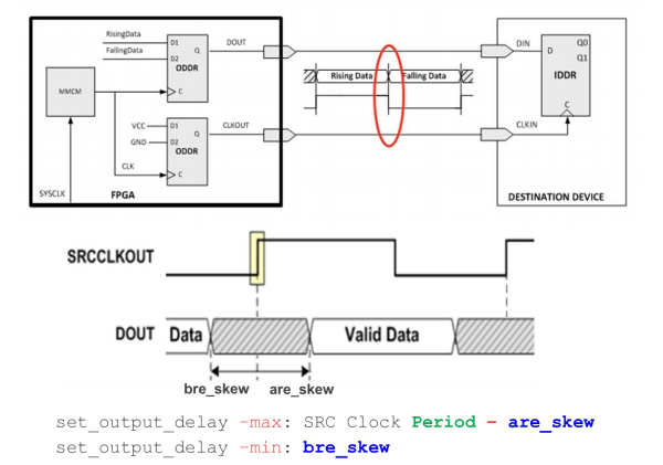 對以上兩種方法稍作總結,就會發(fā)現(xiàn)在設置 DDR 源同步輸出接口時,送出的數(shù)據(jù)是中心對齊的情況下, 用 Setup/Hold Based 方法來寫約束比較容易,而如果是邊沿對齊的情況,則推薦使用 Skew Based 方法來寫 約束。