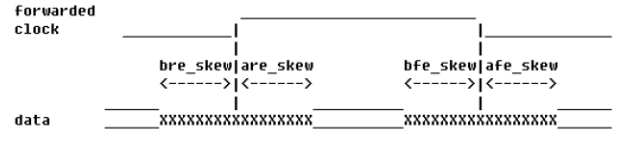 可以這樣計算輸出接口約束:時鐘的周期是 10ns,因為是 DDR 方式,所以數(shù)據(jù)實際的采樣周期是時鐘周 期的一半;上升沿采樣的數(shù)據(jù)的 -max 應該是采樣周期減去這個數(shù)據(jù)的發(fā)送沿(下降沿)之后的數(shù)據(jù) skew 即 afe_skew,而對應的-min 就應該是上升沿之前的數(shù)據(jù) skew 值 bre_skew ;同理,下降沿采樣數(shù)據(jù)的 -max 應該是采樣周期減去這個數(shù)據(jù)的發(fā)送沿(上升沿)之后的數(shù)據(jù) skew 值 are_skew,而對應的-min 就應該是下 降沿之前的數(shù)據(jù) skew 值 bfe_skew 。