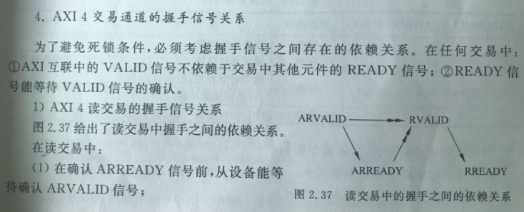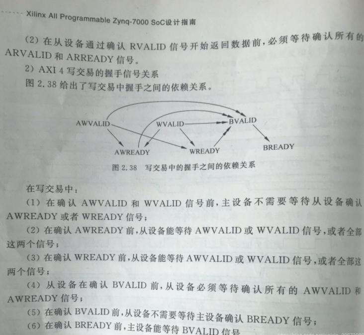 由于Xilinx是將雙核ARM與7系列FPGA集成于一塊硅片構(gòu)成SoC,所以比較重要的一個模塊就是硬核處理器(PS)與可編程邏輯(PL)之間的通信,傳統(tǒng)的有SPI總線、IFC總線的方式,zynq使用的是ARM和Xilinx共同制定的總線協(xié)議AMBA AXI4(Advanced Microcontroller Bus Architec),根據(jù)使用場景不同它有三種標(biāo)準(zhǔn)Lite、Stream、Full,F(xiàn)ull即總線結(jié)構(gòu)最完整的AXI4,4代表第4代,所以要是想和之前第三代總線模塊互聯(lián)的話,之間必須添加總線轉(zhuǎn)換IP,它的總線結(jié)構(gòu)和時序需要好好看看,《Xilinx AP Z-7000 SoC 設(shè)計指南》中有很詳細(xì)介紹,其中有一段關(guān)于交易通道握手信號關(guān)系很重要: