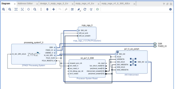 把Zynq PS和上述生成的寄存器IP PL連接起來,其實(shí)很簡單,兩次自動連線就可以了,這里需要強(qiáng)調(diào)的是,需要檢查DDR的配置、MIO的配置和PL時鐘,由于需要串口打印,所以將串口和PS連接起來,具體管腳需要看原理圖,可以看到是14 15,點(diǎn)擊與之對應(yīng)的UART0就可以了。
