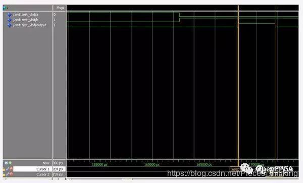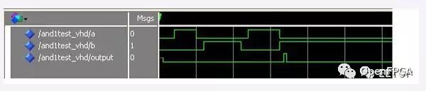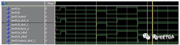 設(shè)計(jì)的一個(gè)二輸入與門(mén),output<=A & B;進(jìn)行布局布線(xiàn)后仿真(此時(shí)沒(méi)有加管腳約束文件)可看到: