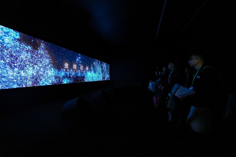 今年,索尼將參觀者面前的這塊屏幕升級為橫10米、縱1.5米的“超寬屏”,結(jié)合中國山水畫“借景”手法,融入自然景觀、周邊水域及群山等元素,創(chuàng)造出空間的延展感與縱深感。同時不再使用實拍與動畫形式,與RED團隊合作進行數(shù)字藝術(shù)創(chuàng)作,融合“昆蟲有機生命律動”與“光粒子編織的精密數(shù)字世界”,打造原創(chuàng)影像作品。除此之外,配套的“風(fēng)”、“振動”與“照明”相輔相成,還原了騎乘在昆蟲背部的感受與類似蜻蜓復(fù)眼所見的奇幻色彩。