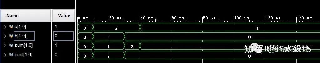 //-------------module-------------// 頂層模塊包含N個(gè)半加器module top(a,b,sum,cout); parameter N=2; input [N-1:0] a, b; output [N-1:0] sum, cout; 聲明一個(gè)暫時(shí)的循環(huán)變量 genvar i; 生成N次 generate for (i = 0; i < N; i = i + 1) begin half_add u0(a[i], b[i], sum[i], cout[i]); end endgenerateendmodule 定義一個(gè)半加器module half_add(a, b, sum, cout); input a,b; output sum,cout; assign sum = a ^ b; assign cout = a & b;endmodule//-------------testbench-------------// 1ns / 1nsmodule top_tb; parameter N = 2; reg [N-1:0] a, b; wire [N-1:0] sum, cout; top instance1( .a(a), .b(b), .sum(sum), .cout(cout)); initial begin a <= 0;= 0; #10 a <= 'h2; b <= 'h3; #20 b <= 'h4; #10 a <= 'h5; endendmodule