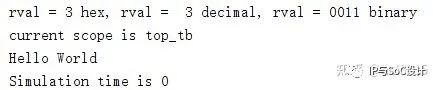 reg [3:0] rval;initial begin rval = 3; $display("rval = %h hex, rval = %d decimal, rval = %b binary", rval, rval, rval); $display("current scope is %m"); // 輸出等級(jí)層次的名字 $display("%s", "Hello World"); //在%和表示輸出格式的字符之間插入一個(gè)0自動(dòng)調(diào)整顯示輸出的數(shù)據(jù)寬度 $display("Simulation time is %0d", $time);end