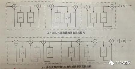 但是這并不是我們常用的濾波器結(jié)構(gòu),既然是積分梳狀濾波器,總得體現(xiàn)一下積分、和梳狀這兩個(gè)特點(diǎn)吧,這名字不是白叫的,因此有如下變形