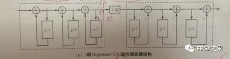我們可以看到,如果是三級(jí)的CICI濾波器級(jí)聯(lián)的話,也就是有3個(gè)積分器和三個(gè)梳狀濾波器,這時(shí)候我們可以利用Noble恒等式進(jìn)行移位變換,讓積分器放在一起,梳狀濾波器放在一起,這時(shí)候的梳狀濾波器是M階的,因?yàn)榇藭r(shí)還沒有經(jīng)過(guò)抽取,所以我們可以再利用Noble恒等式,將抽取器放到梳狀濾波器之前,這樣的話,梳狀濾波器就會(huì)降為1階,長(zhǎng)度為2,從而大大節(jié)省了硬件資源