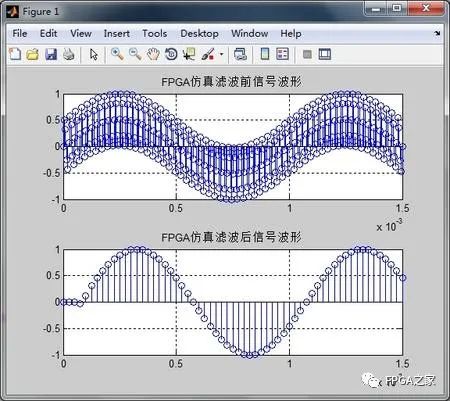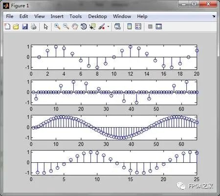 接著,我們將FPGA的輸出信號(hào)讀到matlab中進(jìn)行仿真,繪出輸出信號(hào)的時(shí)域波形