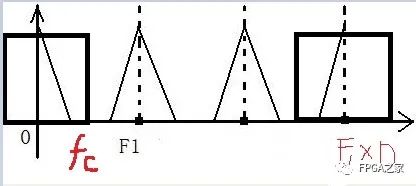 需要注意的一點(diǎn)就是,插值前后,我們只是在時(shí)域信號(hào)中間插入了D-1個(gè)零值,僅僅是改變了采樣率,并沒有改變信號(hào)的信息,因此,在頻域,信號(hào)頻譜的形狀是不會(huì)改變的,改變的僅僅是周期,如上圖,F(xiàn)1是插值之前信號(hào)的周期,插值之后,信號(hào)頻譜的形狀不變,周期成了F1*D,D是插值倍數(shù)。如果我們直接用F1*D倍的采樣率采信號(hào),得到的頻譜會(huì)發(fā)現(xiàn),就不會(huì)有中間兩個(gè)波形,因此,這兩個(gè)波形是多余的,書上叫做是鏡像頻譜。既然是多余的,我們就可以將它用一個(gè)低通濾波器濾掉,這樣的低通濾波器,就叫做鏡像低通濾波器。這樣我們來(lái)計(jì)算一下鏡像低通濾波器的截止頻率