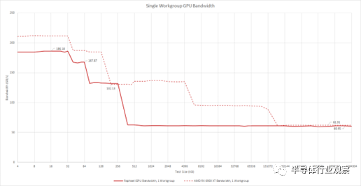 不幸的是,測試帶寬并沒有告訴我們?nèi)魏慰赡艿慕Y(jié)構(gòu)限制。我們從 DRAM 大小的區(qū)域獲得超過 60 GB/s 的速度。來自另一個 RDNA2 實施的數(shù)據(jù)表明,無論如何,單個 WGP 不能從 DRAM 中提取超過 60 GB/s 的數(shù)據(jù)。如果 iGPU 具有 32 字節(jié)/周期的結(jié)構(gòu)鏈接,則 2 GHz 結(jié)構(gòu)時鐘將提供 64 GB/s 的帶寬。這足以養(yǎng)活一個 WGP。