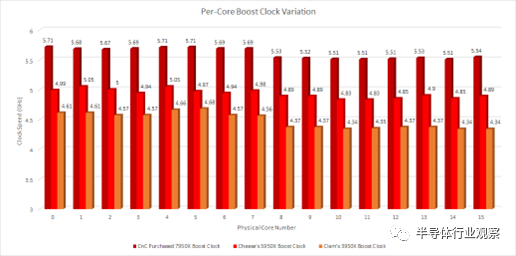 如果您的操作系統(tǒng)的調(diào)度程序沒有優(yōu)先安排最佳內(nèi)核上的低線程任務,則 3950X 的性能可能會出現(xiàn)相當大的變化。Ryzen 5950X 和 7950X 在這方面要好得多。雖然時鐘速度差異是可以測量的,但感受 3-4% 的性能差異要比感受 7-8% 的性能差異要困難得多。