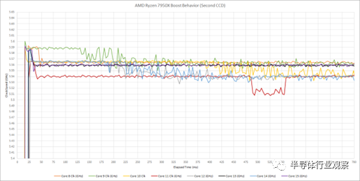 讓我們一次處理一個 CCD,因為有很多數(shù)據(jù)。根據(jù)內(nèi)核的不同,我們在 700 毫秒的時間窗口內(nèi)看到了略高于 5.71 GHz 的時鐘。然而,結(jié)果千差萬別。一些內(nèi)核,如內(nèi)核 0 和 2,在不到 50 毫秒的時間內(nèi)提升至 5.74 GHz,然后降至 5.71 GHz。Core 2 保持 5.74 GHz 將近半秒,然后表現(xiàn)出不穩(wěn)定的行為。