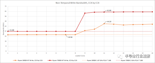 的結(jié)構(gòu)讀取鏈接和一個 16B/cycle的寫入鏈接。在上一篇文章中,我們注意到 DDR5-6000 的寫入帶寬可能受到來自兩個 CCD 的 16B/周期鏈接的限制。我們從一個 CCD 看到了類似的讀取帶寬限制。我們使用 3 GB 測試大小和縮放線程數(shù)運行內(nèi)存帶寬測試以命中所有物理內(nèi)核。CCX 和 CCD 一個接一個地裝滿。在 3950X 上,這意味著首先在 CCD 上填充兩個 CCX。從結(jié)果中,我們可以清楚地看到單個 7950X CCD 受到其與結(jié)構(gòu)的 32B/cycle鏈接的限制。