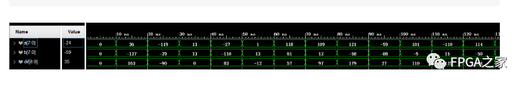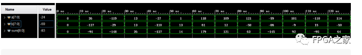 這是對有符號數(shù)設(shè)計(jì)的加減法器,可以看到上面的加減法都完成的很棒,并沒有產(chǎn)生溢出的問題。
