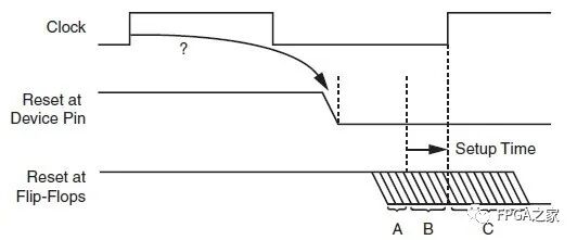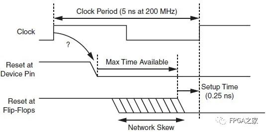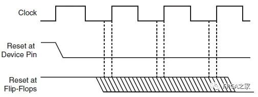 隨著時(shí)鐘信號(hào)頻率的增高和器件規(guī)模增大帶來(lái)的潛在的時(shí)鐘偏移,在同一個(gè)時(shí)鐘邊沿對(duì)所有的觸發(fā)器進(jìn)行是否已經(jīng)幾乎是不可能的了。圖3顯示了高時(shí)鐘頻率下的復(fù)位時(shí)序圖。