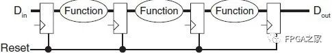 好消息是,在絕大多數(shù)設(shè)計(jì)中(白皮書(shū)說(shuō)是超過(guò)99.99%?應(yīng)該是老外寫文檔的習(xí)慣吧),復(fù)位信號(hào)的時(shí)序是無(wú)關(guān)緊要的——通常情況下,大部分電路都能夠正常工作。然而,只要你曾經(jīng)遇到過(guò)復(fù)位信號(hào)不正常導(dǎo)致電路無(wú)法正確工作的情況,那么可以說(shuō)你“幸運(yùn)”地遇到了那0.01%的復(fù)位信號(hào)異常的情況。圖4給出了一個(gè)流水線復(fù)位的情況。