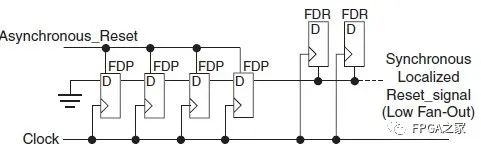 鏈中觸發(fā)器的數(shù)目決定了局部復(fù)位網(wǎng)絡(luò)所需要的復(fù)位脈沖的最小寬度。最后的結(jié)果是,鏈中最后一個(gè)觸發(fā)器從高跳變到低,而局部復(fù)位信號(hào)的釋放與時(shí)鐘周期同步。被復(fù)位的觸發(fā)器可以采用同步置位(synchronous set (FDS))或者同步復(fù)位(synchronous reset (FDR)),即構(gòu)成了完整的同步設(shè)計(jì),而接下來(lái)的時(shí)序規(guī)范和分析也將容易得多。
