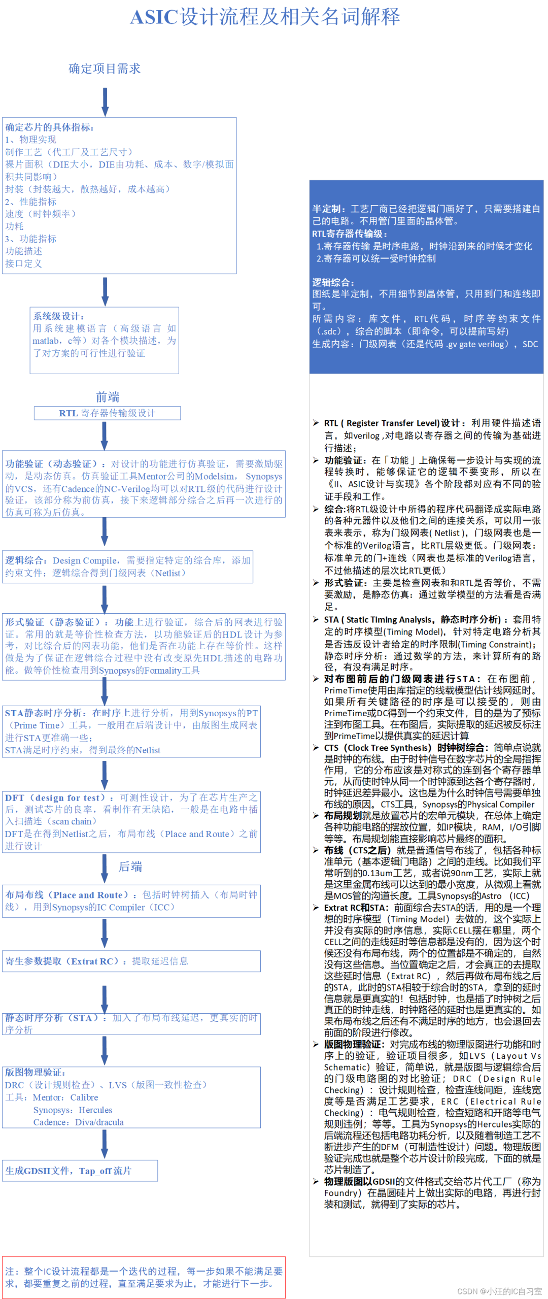 (注:整個IC設(shè)計流程都是一個迭代的過程,每一步如果不能滿足要求,都要重復(fù)之前的過程,直至滿足要求為止,才能進行下一步。)