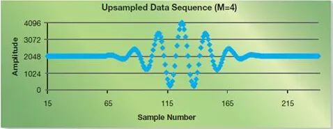 如果用12位ADC以80MHz的頻率對(duì)圖1所示的信號(hào)進(jìn)行采樣或量化,輸入范圍為ADC完整輸入范圍的97.7%,則每個(gè)信號(hào)周期只能采樣五次,產(chǎn)生的樣本數(shù)據(jù)序列如圖2所示。如果對(duì)該示例數(shù)據(jù)序列進(jìn)行四倍上采樣,則有效采樣率為320MHz,每個(gè)信號(hào)周期能夠提供20個(gè)樣本。雖然您可以使用本文介紹的方法進(jìn)行更高倍數(shù)的上采樣,但為了說明起見我們還是使用M=4的上采樣。
