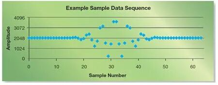 圖2 - 本圖是12位ADC,輸入范圍為ADC完整輸入范圍的97.7%,用80MHz或每周期五次頻率對(duì)圖1的模擬信號(hào)采樣得到的樣本數(shù)據(jù)序列實(shí)例。