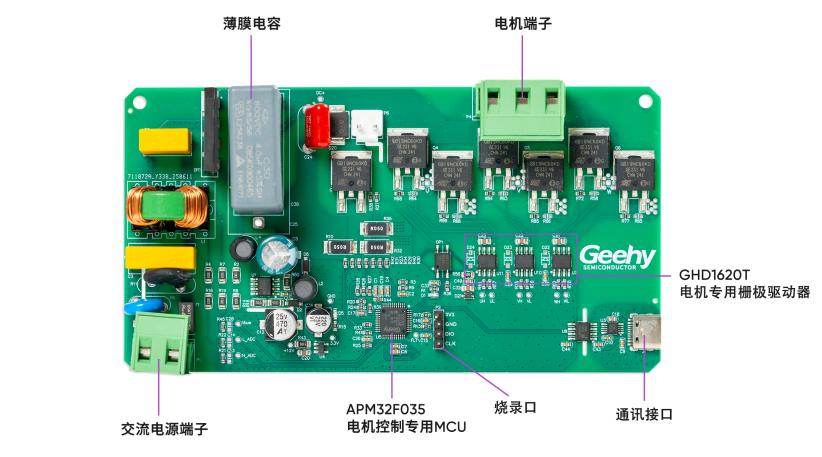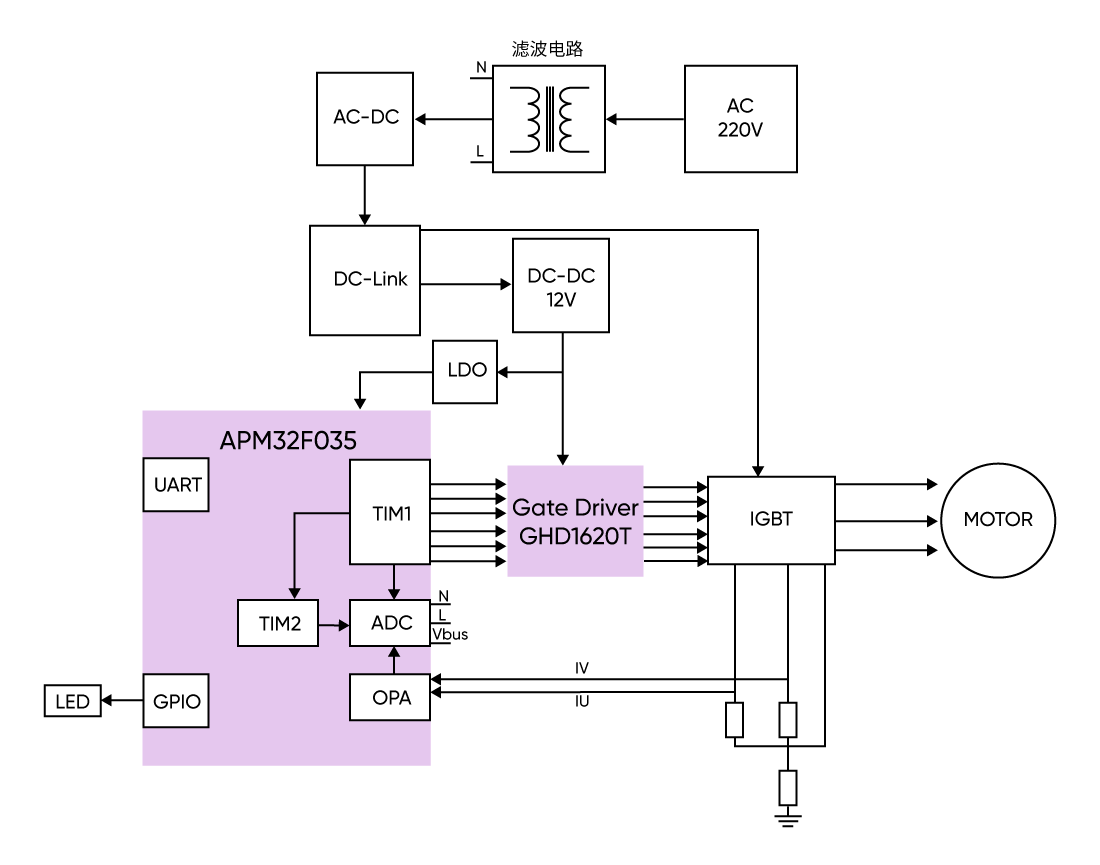 該方案在交流電壓濾波整流后的電路中采用薄膜電容,并以APM32F035為主控芯片,檢測交流電壓與電機相電流的矢量控制,通過TIM1的3組互補PWM輸出至GHD1620T,來控制IGBT開關實現電平逆變,從而驅動永磁同步電機運行。