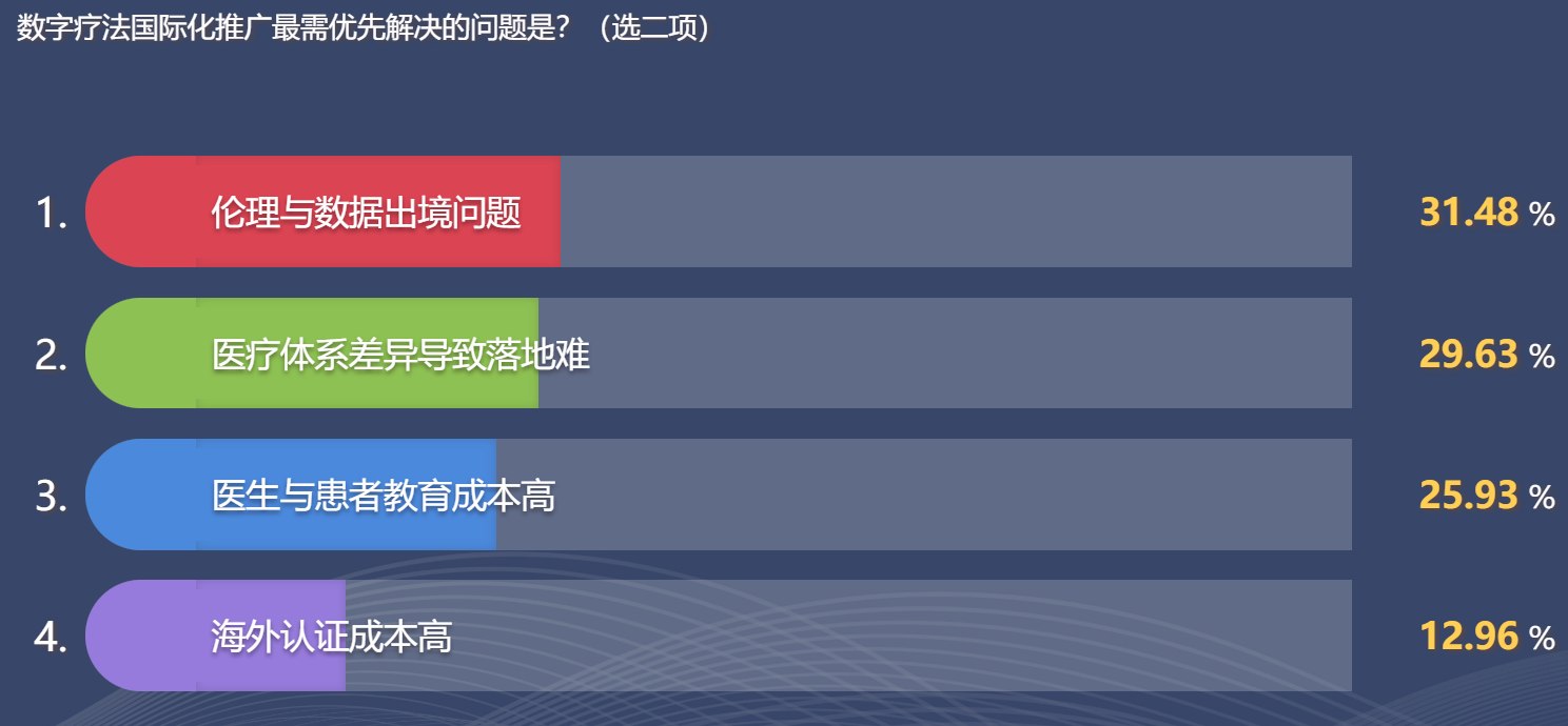 出海不是技術(shù)輸出,而是制度適配與信任重建。超過(guò)六成投票者將“數(shù)據(jù)跨境合規(guī)”與“本地醫(yī)療體系差異”列為首要挑戰(zhàn),說(shuō)明中國(guó)數(shù)字療法若要走向全球,必須超越產(chǎn)品思維,深入理解目標(biāo)市場(chǎng)的倫理框架、臨床路徑與支付邏輯。正如馬寧所言,“借船出?!薄ㄟ^(guò)與海外頂尖機(jī)構(gòu)聯(lián)合研究、嵌入當(dāng)?shù)刂改希蚴歉尚械膰?guó)際化策略。