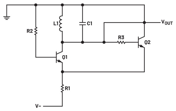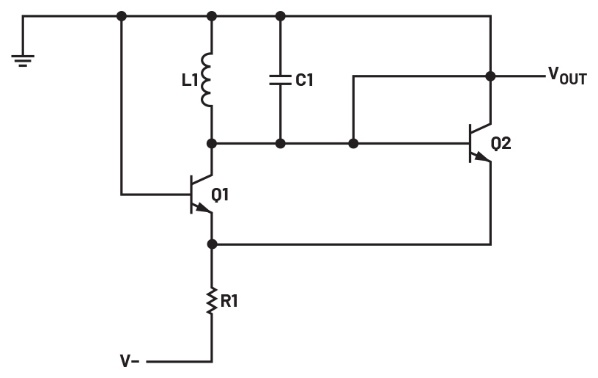 構(gòu)建圖1和圖2所示Peltz振蕩器的仿真原理圖。計算偏置電阻R1的值,使得晶體管Q1和Q2中的集電極電流均大于200 μA。假設(shè)電路采用-5 V電源供電。計算C1和L1的值,使得諧振頻率至少為1 MHz。執(zhí)行瞬態(tài)仿真。LC諧振電路的峰峰值輸出擺幅應(yīng)限制在±1個二極管正向壓降(~±0.6 V)以內(nèi)。計算并模擬R2 = R3時的阻值,使得輸出擺幅提高到至少±1.25 V。保存這些結(jié)果以與實際電路的測量結(jié)果進行比較,并記錄在實驗報告中。