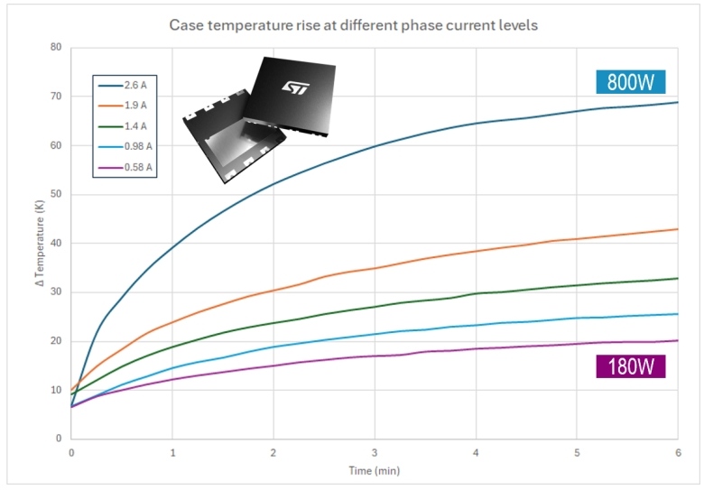 該GaN開關(guān)管可以安全地輸出約 800 W 的功率,而不會發(fā)生熱失控。溫升 Δt 小于 70 °C,在達到 150 °C 的最高工作結(jié)溫 (TJmax)之前,有充足的安全裕量。