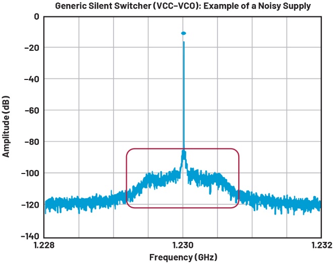 圖3.高噪聲SMPS的相位噪聲圖示例(1.23 GHz,2 MHz范圍)