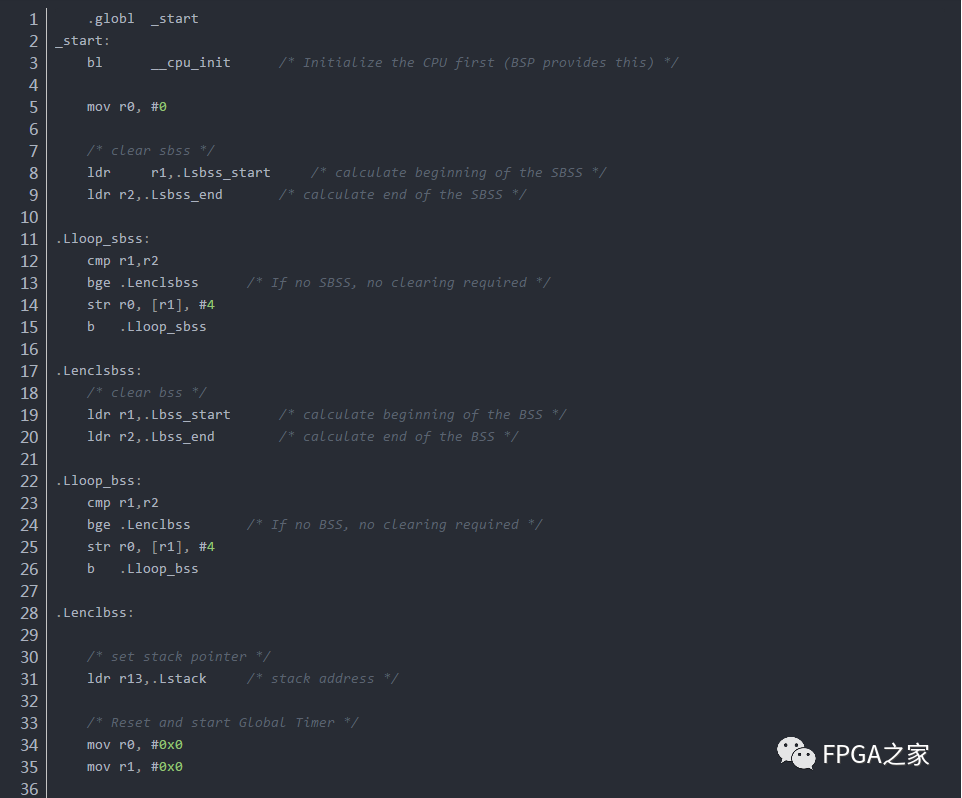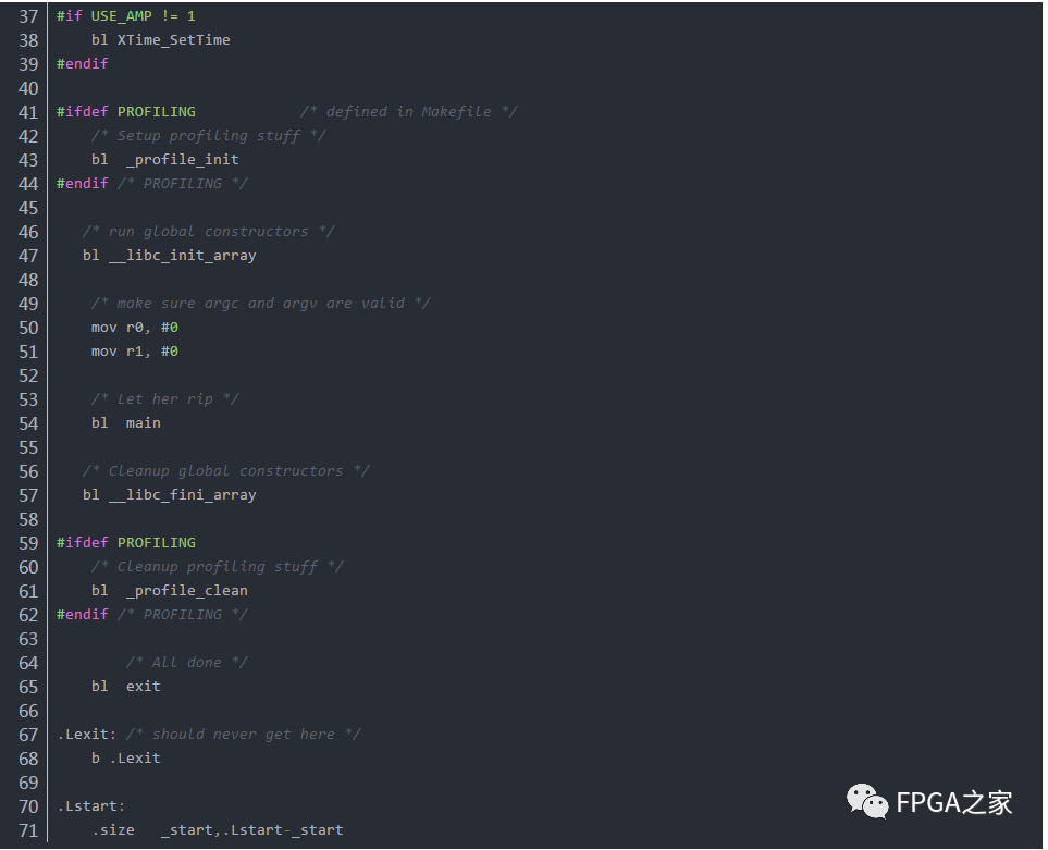 一樣的,我們不仔細展開這段匯編,其實通過注釋就能夠明白,這里的主要功能就是初始化各種數(shù)據(jù),包括bss等等。最后,匯編來到了main,這個main就是FSBL的主函數(shù),也就是大家比較熟悉的c語言函數(shù)。