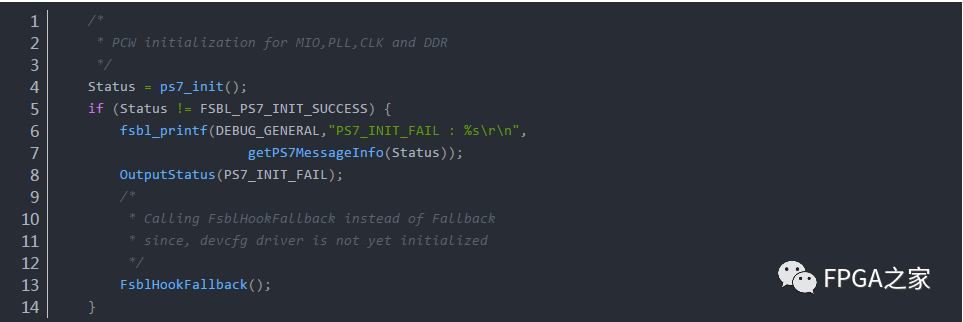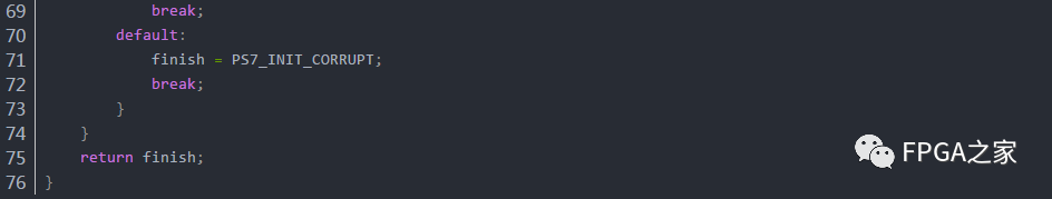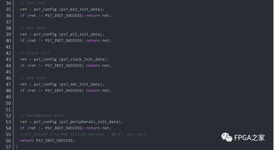 如果看過我們上一篇blog應該有個印象,MIO不是已經(jīng)被初始化過一遍嗎,怎么又要?是的,就是這么靈活,也就是說你的FSBL可以在Qspi(這樣BootROM只會初始化Qspi的接口MIO)里,你的BitStream可以保存在eMMC上,那這個多出來的eMMC的MIO也需要在初始化一下了。不多講,直接看ps7_init()