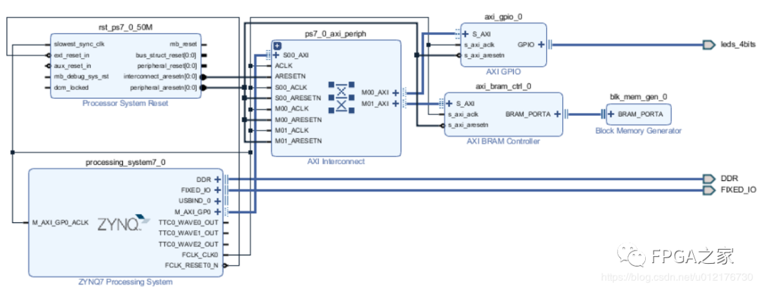 1.4 AXI GPIO & AXI BRAM Controller, 這兩個就是上述的Xilinx的IP,自帶有AXI4總線接口,這樣ARM就能夠通過總線解析器控制他們