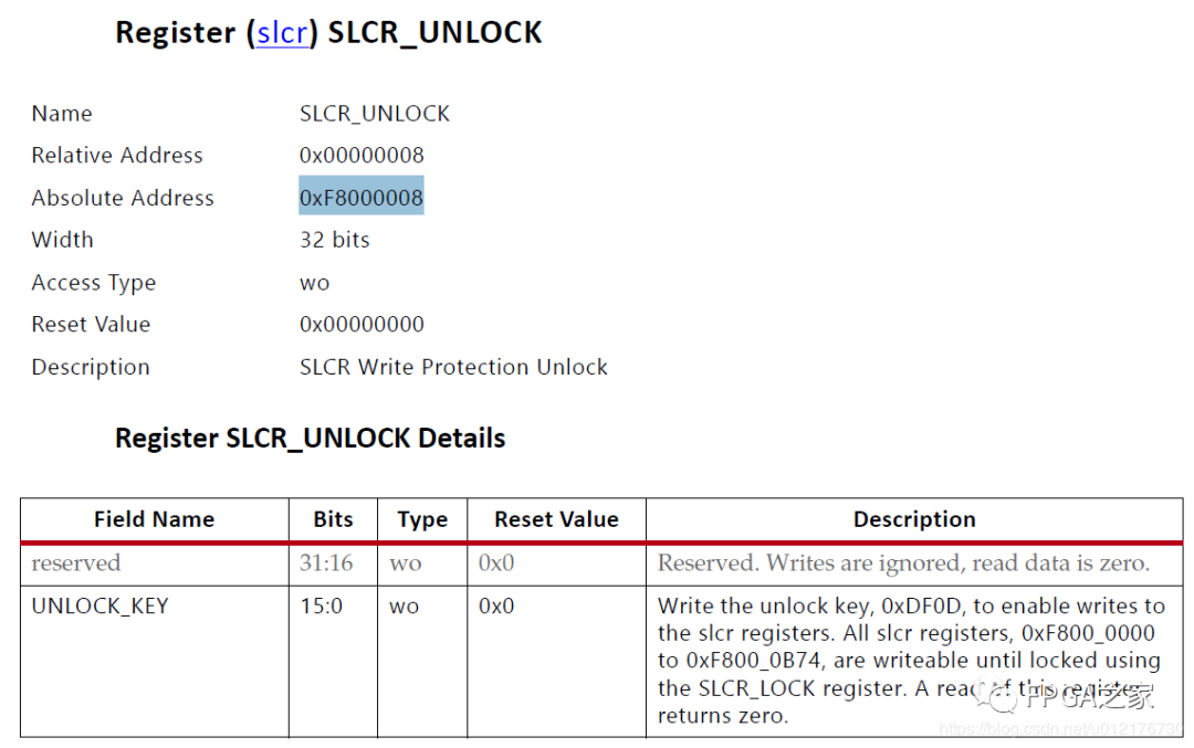 而0XF8000008這個地址,通過查看TRM,實際上就是給SCLR_UNLOCK寄存器寫入0xDF0D,目的就是為了解鎖SCLR所有的寄存器,使其可寫,也就是說沒有完成這一步的話,SCLR的其余寄存器使不允許寫操作的!