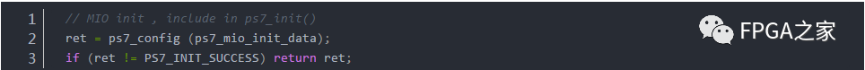Xilinx希望通過這種比較奇怪的方式完成了一系列操作(EMIT_WRITE和其他操作)的封裝成一個組合(ps7_mio_init_data_1_0),這一些列的操作共同完成了比如說MIO的初始化,DDR的初始化等等。同時Xilinx提供了一個函數(shù)去解讀這些操作,**ps7_config ()**正是為了實現(xiàn)這個功能,如下所示,利用ps7_config ()和ps7_mio_init_data來完成MIO的初始化