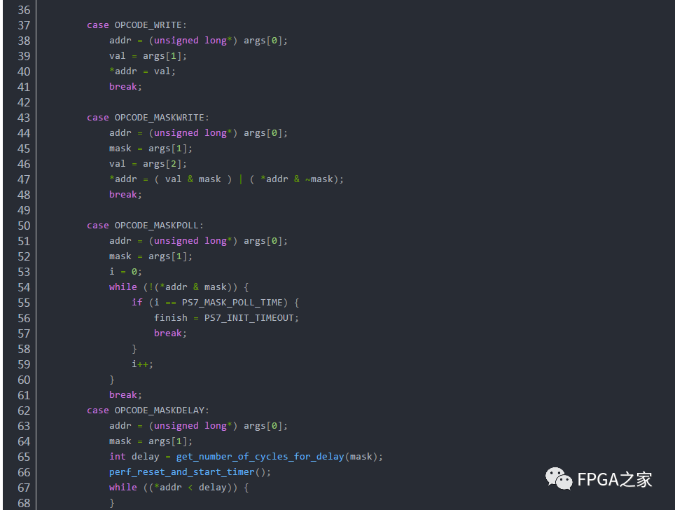 該函數(shù)很簡單,實際上就是EMIT_WRITE,EMIT_EXIT,EMIT_READ等一系列操作的解包過程,有興趣的可以深入查看一下。需要注意的是,最后一個操作一定是EMIT_EXIT,也就是說不管是ps7_mio_init_data還是ps7_pll_init_data,這些數(shù)組的最后一個元素(操作)一定是EMIT_EXIT,讀者可自行檢查。