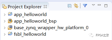 2 利用這個范例,我們進一步建立BSP,然后基于BSP建立APP(用戶程序),以及FSBL(范例,Zynq的加載程序),如下圖所示,其包含了app, bsp, platform, fsbl。通過任何一個開發(fā)版的用戶手冊都可以獲得完整的工程建立流程,這里不再贅述。