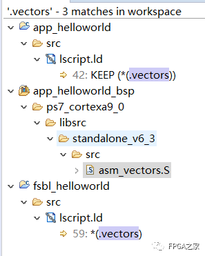 (2)將代碼段(.text*)鏈接到ps7_ram_0_S_AXI_BASEADDR的最前頭,而這里的代碼段實際包含了.vector等等內(nèi)容,我們查看一下.vectors到底是個啥吧,搜索一下把,結果就在bsp的asm_vectors.S(匯編文件里面)