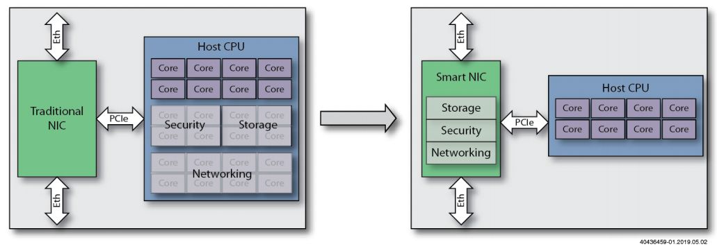 智能網(wǎng)卡被用于不同的部署中,包括存儲(chǔ)、安全和網(wǎng)絡(luò)處理。如下圖所示,最終目標(biāo)是實(shí)現(xiàn)消耗更少處理器內(nèi)核的解決方案,同時(shí)以更低的成本提供更高的性能。