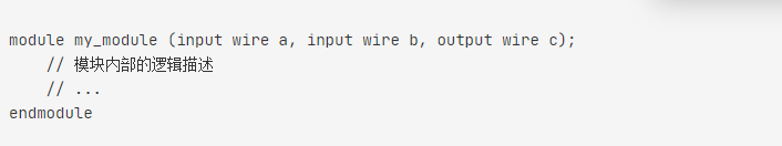 Verilog程序由一個(gè)或多個(gè)模塊組成。模塊是Verilog中的最基本單位,用于描述特定的電路功能。以下是一個(gè)簡(jiǎn)單的模塊定義的示例:
