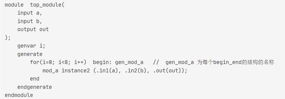 注意:模塊多次實(shí)例化時(shí)必須寫(xiě)每個(gè)begin_end結(jié)構(gòu)的名稱(chēng)(gen_mod_a);