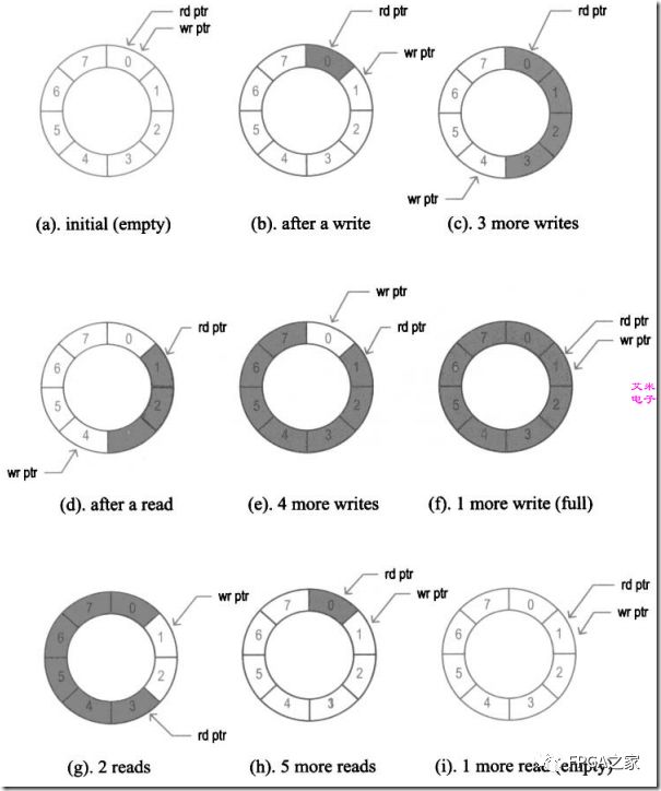 一種實(shí)現(xiàn)FIFO緩存的方法是給寄存器文件添加一個(gè)控制電路。寄存器文件通過兩個(gè)指針像循環(huán)隊(duì)列一樣來排列寄存器。寫指針(write poniter)指向隊(duì)列的頭(head);讀指針(read poniter)指向隊(duì)列的尾(tail)。每次讀操作或?qū)懖僮?,指針都?huì)前進(jìn)一個(gè)位置。8-字循環(huán)隊(duì)列的操作如圖2所示。
